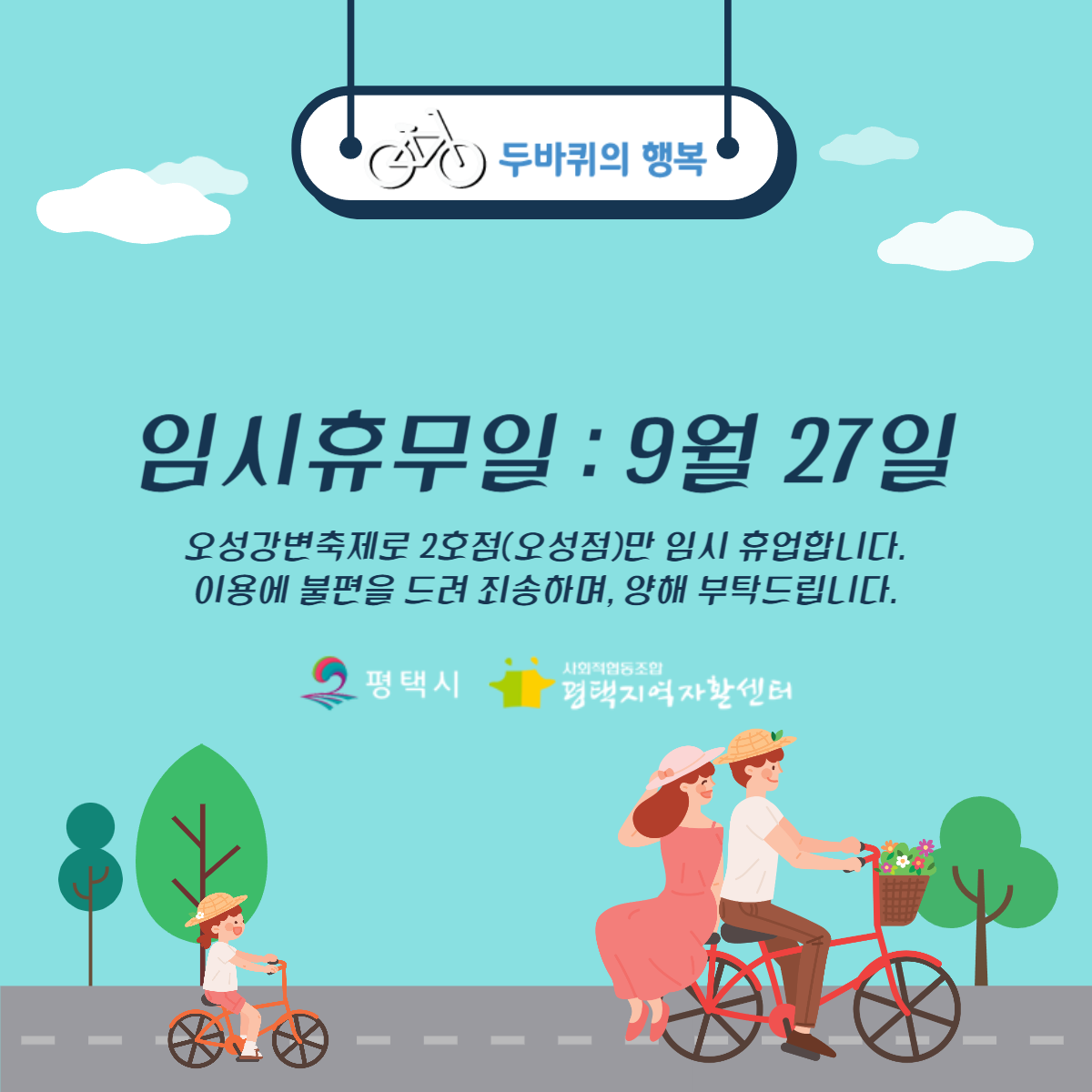 “두바퀴의 행복”은 시민과 관광객 누구나 자유롭게 이용할 수 있는 평택시 공공 관광자전거 무료대여서비스입니다.